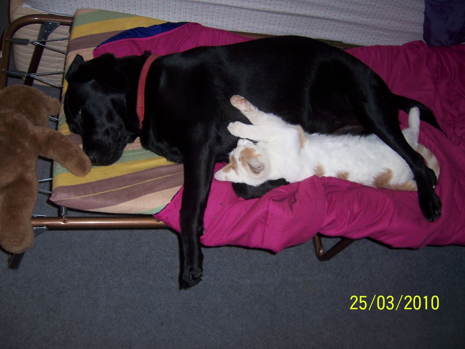 Snowball is Mr Essess little boy kitteh, he is 5 months old and seems to think that the Labrador is his mother.....